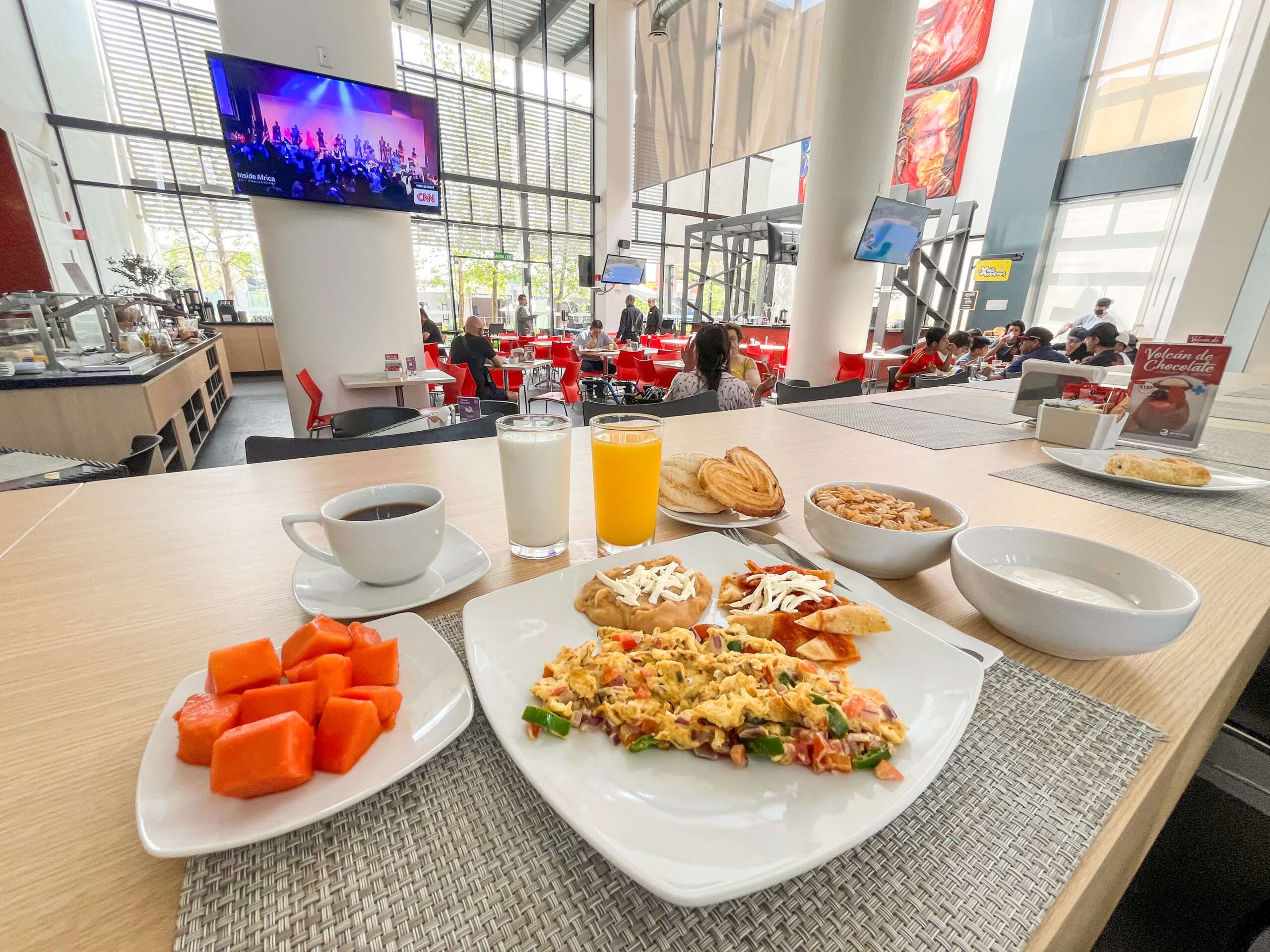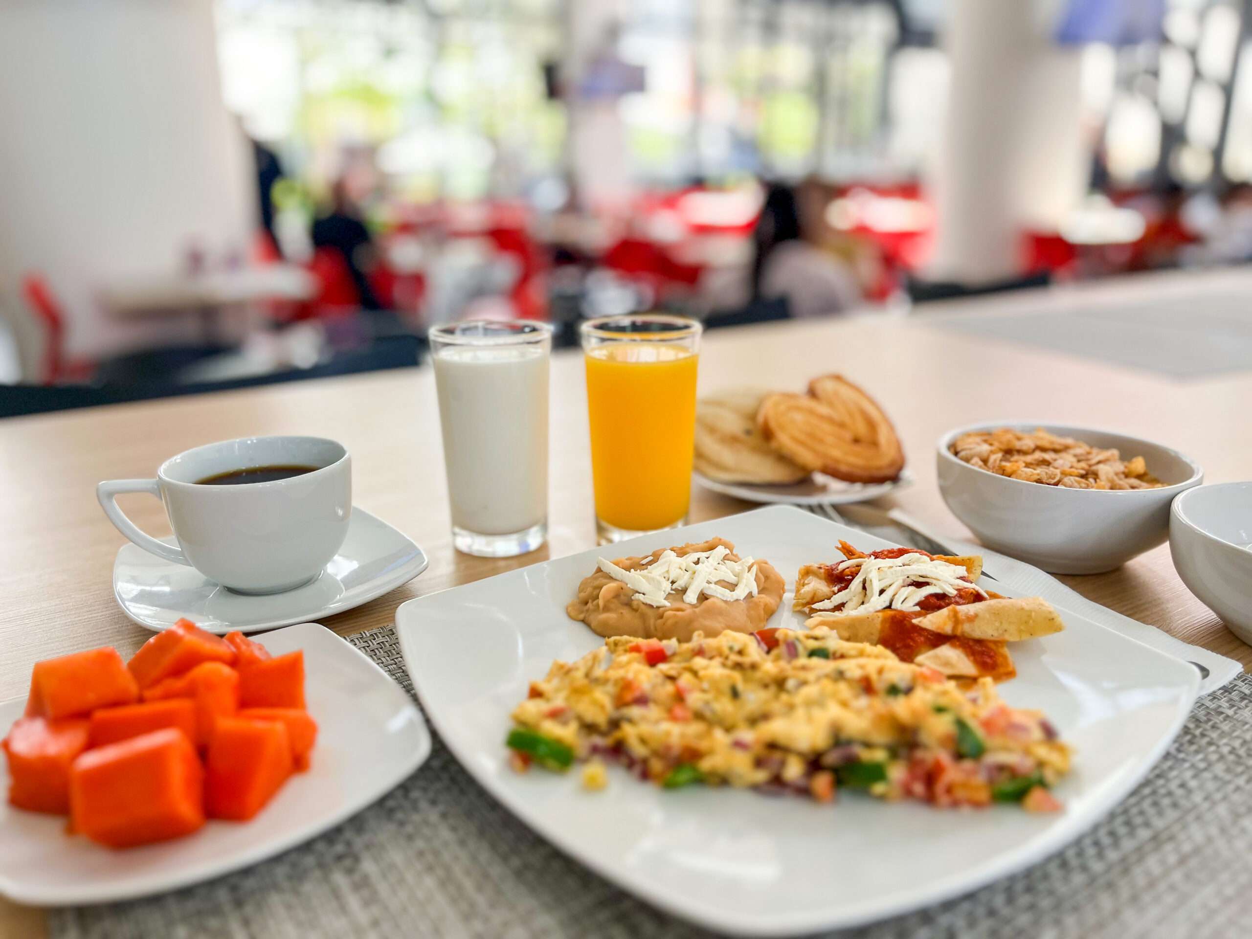 Apetitoso y saludable desayuno con alimentos calientes y fríos, una amplia variedad de frutas, cafés y tés